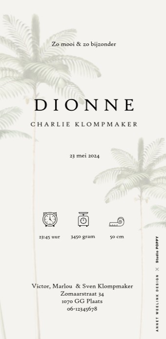 Geboortekaartje 'Dreamy Jungle' van Annet Weelink Design.