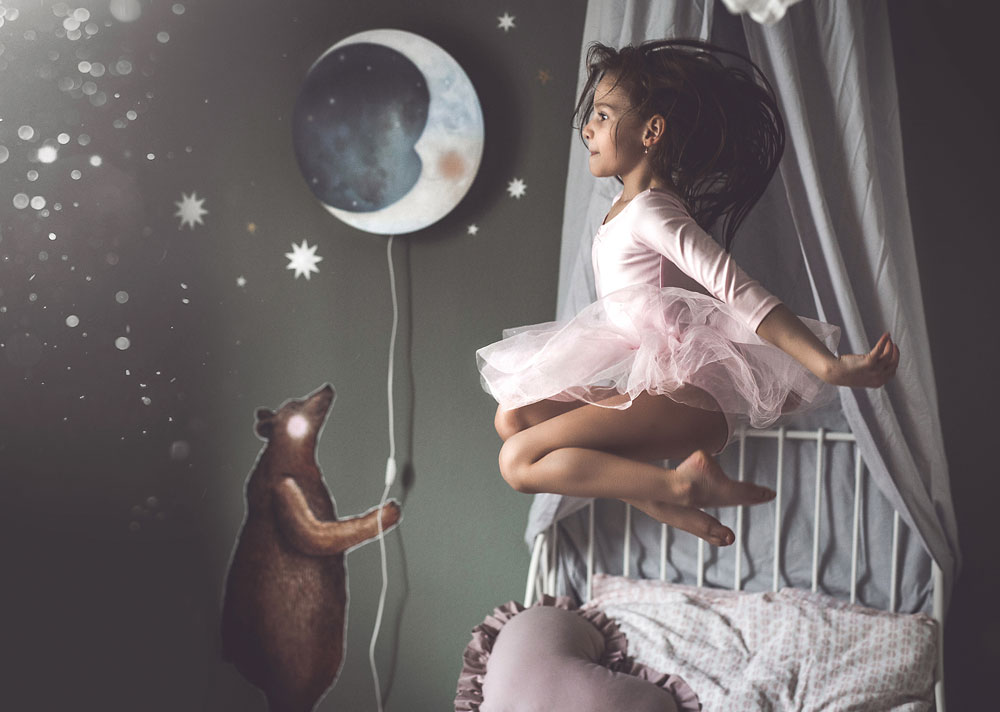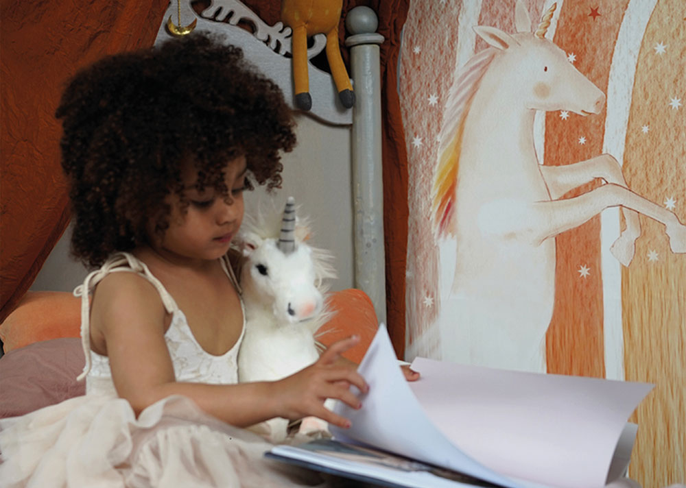 De bijpassende wandlampen, muurstickers en behangcirkels brengen het verhaal tot leven in de kinderkamer.